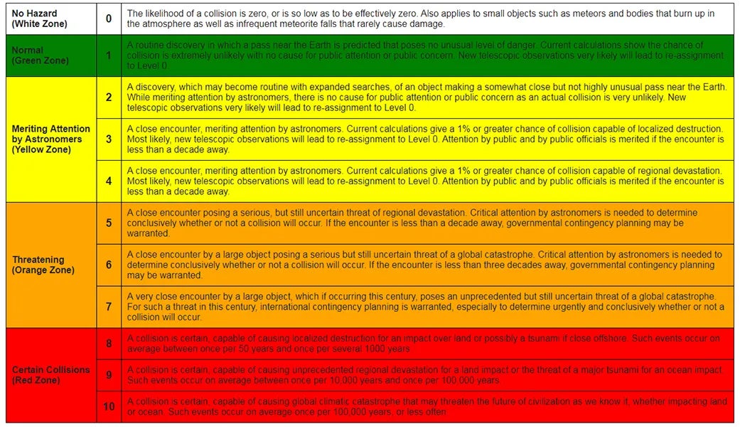 2024 YR4 ha estat catalogat com a asteroide de nivell 3 dins de l’escala de risc d’impacte de Torí. Aquesta qualificació implica que 2024 YR4 és un asteroide que “mereix atenció pels astrònoms”, i que es defineix com a “una trobada pròxima, que mereix l’atenció dels astrònoms. Els càlculs actuals donen un 1% o més de possibilitats de col·lisió capaç de destrucció localitzada. El més probable és que les noves observacions telescòpiques condueixin a la reassignació al nivell 0. Es mereix l’atenció del públic i dels funcionaris públics si la trobada està a menys d’una dècada”.