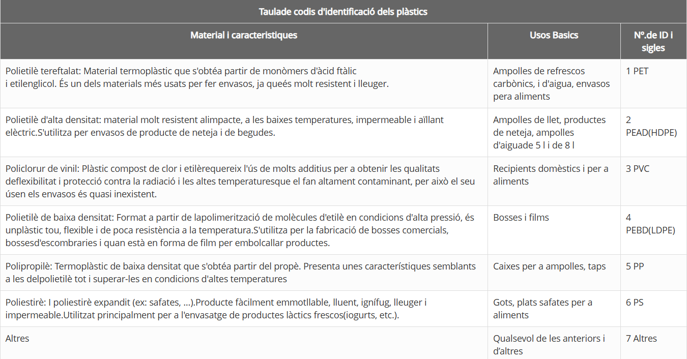 Aquests residus plàstics s’identifiquen a través d’una taula de codis d’identificació dels plàstics per poder-ne facilitar el seu reciclatge tal com indica l’Agència de Residus de Catalunya (ARC).