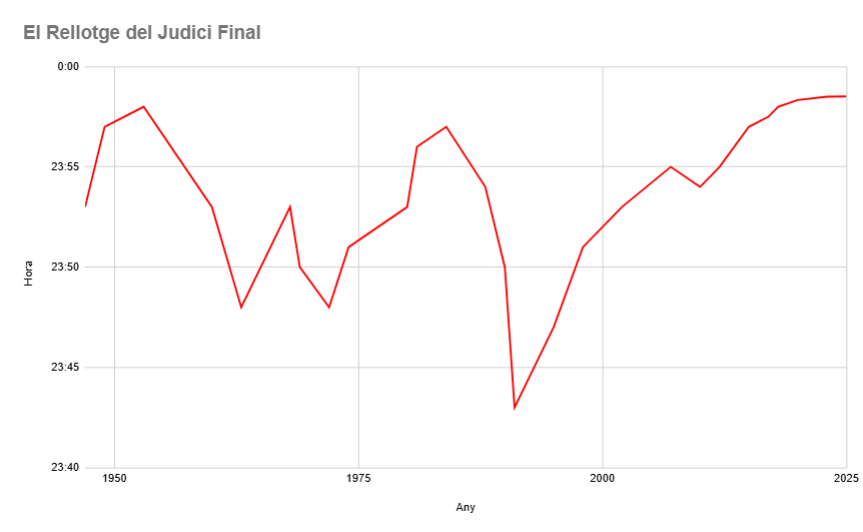 El Rellotge de la Fi del Món és un rellotge de 24 hores que quantifica el perill d’una possible extinció humana: com més s’apropa a la mitjanit (00.00 h), més a prop s’està un eventual final de l’espècie humana. Entre els factors que s’analitzen per quantificar el perill hi podem trobar les tensions geopolítiques (ara mateix Gaza i Ucraïna), l’expansionisme de l’energia i l’armament nuclear, els desastres ambientals, l’augment de les temperatures o el canvi climàtic. Una sèrie d’aspectes que han portat a determinar que aquest 2025 queden 89 segons per al Dia del Judici Final, o, cosa que és el mateix, la fi del món és més a prop que mai.
