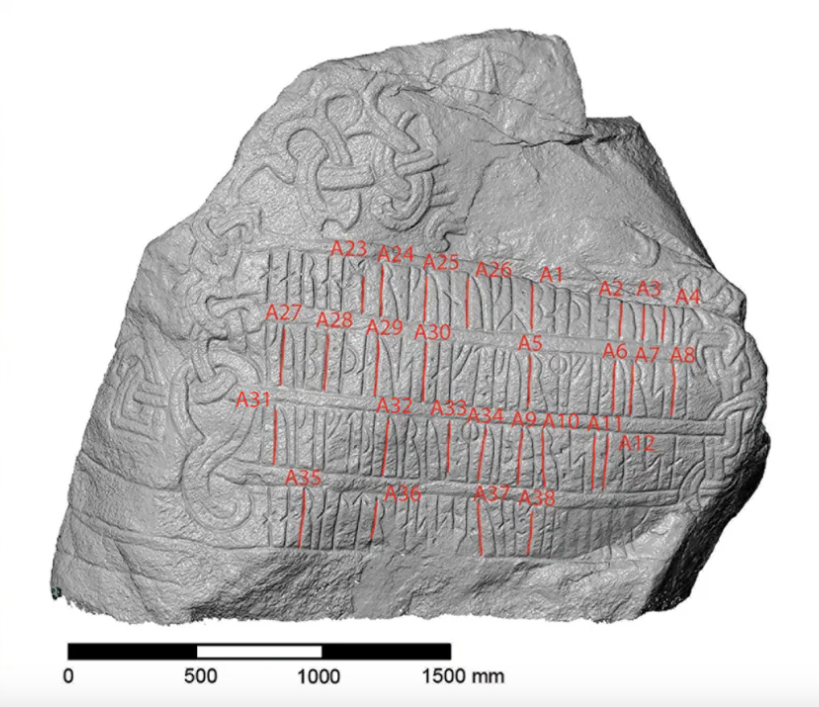Uno de los textos proviene de dos monumentos conocidos como las Piedras de Jelling, por el nombre del pueblo donde se encuentran, y que fueron grabadas alrededor del año 965. De las dos, la más gorda a menudo es conocida como el «certificado de nacimiento de Dinamarca» porque es lo primero que contiene el nombre del país en el momento en que el cristianismo empezaba a tener cierta importancia.