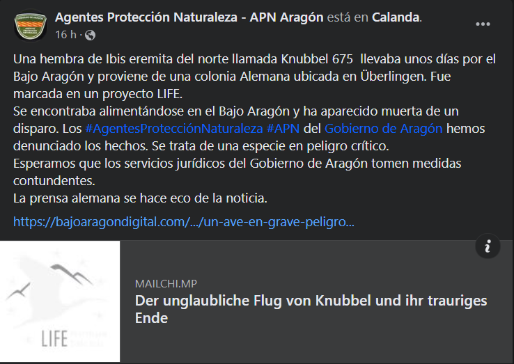 La Knubbel, un ejemplar hembra de Ibis Eremita, una ave en peligro de extinción, murió a rasgos cuando se encontraba en el Aragón, un hecho que el proyecto de la Comisión Europea, Life Northern Bald Ibis, ha denunciado y lamentado a través de un comunicado: «Todo esto fue puesto fin de manera absurda y despreciable por el perpetrador. Lamentablemente, el caso de Knubbel pone de relieve trágicamente que la caza ilegal de pájaros supone una importante amenaza para la biodiversidad no solo en Italia, sino también a lo largo de la ruta migratoria hacia Andalucía».