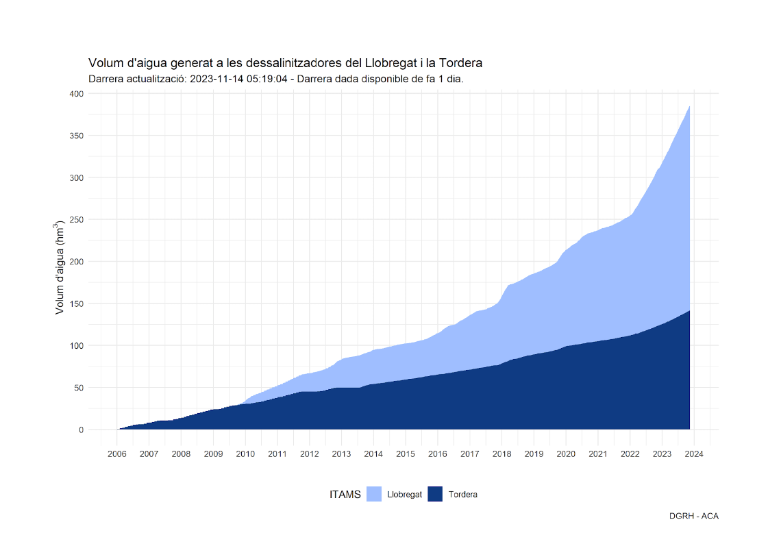 Les dessalinitzadores catalanes incrementen la seva producció a mesura que disminueixen les reserves dels embassaments, fent possible una gestió flexible de les diferents fonts d’aigua. En anys humits, la producció d’aigua dessalinitzada és del voltant del 20% de la capacitat de les plantes. En anys normals, aquesta ascendeix fins al 30%, però en cas de trobar-nos en un any sec, la producció puja fins al 85%.